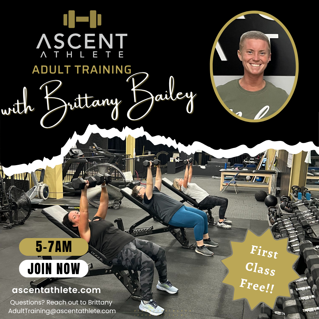 Join us at Ascent Athlete and experience the transformative power of Adult Training. Let Brittany guide you on a journey to peak fitness, where every session brings you closer to your goals. Take the first step – your first class is on us!